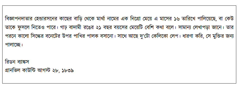 এখান থেকে বেরতেই হবে। এই দীর্ঘ সময় ধরে তার মনে হানা দিচ্ছিল জাদুঘরের সেইসব ভয়ংকর দৃশ্য। সিজারকে নিয়ে কিছু লোক হুল্লোড় করছে। গোলাম পাকড়াওকারীদের গাড়ির মেঝেয় এখন সে গড়াগড়ি খাচ্ছে। তাকে বেদম পেটানো হয়েছে। র‌্যান্ডেলে পৌঁছাতে এখনও অর্ধেক পথ বাকি। সেখানেই আসল শাস্তি পাবে সে। দয়ালু সাম এখন জেলখানায়। তার গায়ে আলকাতরা লেপে দেয়া হয়েছে। তাতে জড়িয়ে দিয়েছে পাখির পাখনা। মেরে হাড়গোড় গুড়ো করে দিয়েছে। তার কাছে গোপন রেলরোড সম্পর্কে জানতে জিজ্ঞাসাবাদে এসবই করেছে র‌্যান্ডেলের ভাড়াটে গুন্ডারা। এখন সে বেহুঁশ পড়ে আছে। …