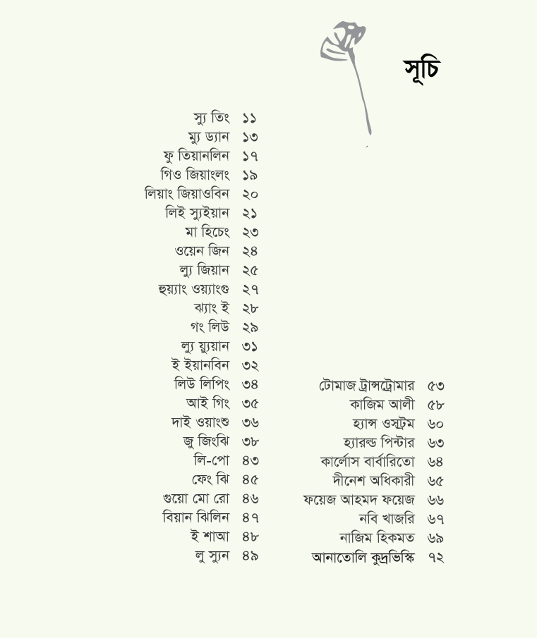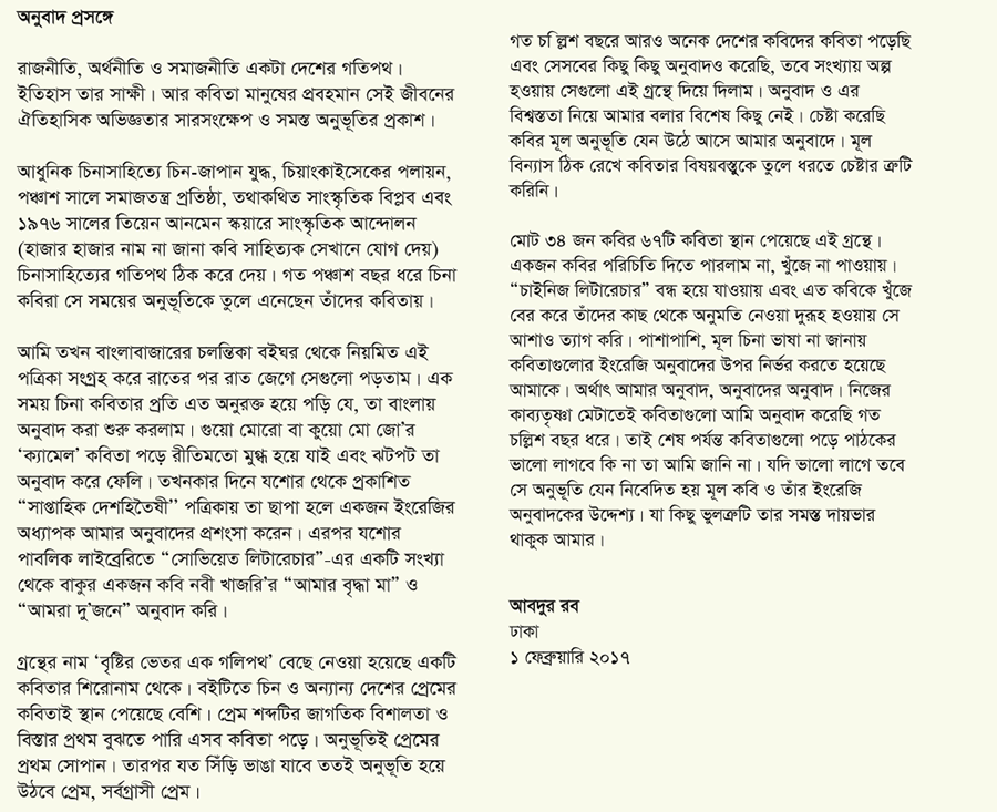 বৃষ্টির ভেতর এক গলিপথ ফেব্রুয়ারি 22, 2017 জুলাই 6, 2020 বিবিধ আশির দশকের অন্যতম কবি আবদুর রবের অনুবাদ চিন ও অন্যান্য দেশের প্রেমের কবিতার সংকলন একুশের বইমেলা ২০১৭ $9.99 – Purchase Checkout Added to cart Purchase Ebook Facebook Comments লেখকের অন্যান্য লেখা Previous Postসেলিম রেজা নিউটনের কবিতা: আমি আমার নিজের মন্তাজ Next Postআশরাফুল মোসাদ্দেক: মায়া সারিশভিলি এর চারটি কবিতা মন্তব্য করুন জবাব বাতিলআপনার ই-মেইল এ্যাড্রেস প্রকাশিত হবে না। * চিহ্নিত বিষয়গুলো আবশ্যক।CommentName* Email* Website Save my name, email, and site URL in my browser for next time I post a comment.